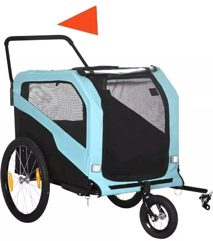 Experience the versatility and convenience of the Aosom 2-in-1 Dog Bike Trailer, a must-have for pet owners who value safety and comfort for their furry friends. Designed to seamlessly transform from a bike trailer to a standalone pet stroller, this carrier is suitable for large dogs up to 66 pounds. The durable steel frame and water-resistant Oxford fabric provide a sturdy and dry environment, while the spacious 67-inch length, 35.5-inch height, and 30.25-inch width offer ample room for your pet to relax or play. Equipped with a hitch for easy attachment to your bike or cart, this pet trailer carrier is ideal for both outdoor adventures and casual walks. The blue color adds a touch of style, and the vintage design ensures that this trailer is not only practical but also a timeless addition to your pet accessories. Please note, the trailer meets the California Prop 65 standards, and the vintage item may expose you to substances like wood dust and formaldehyde, which are known to the State of California to cause cancer.