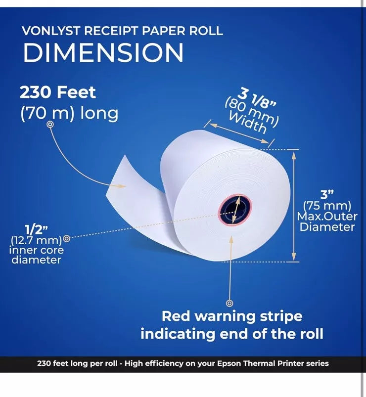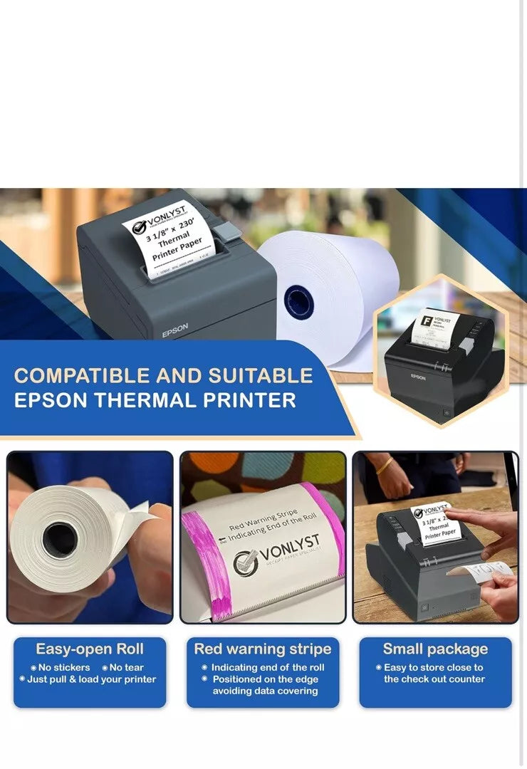 This pack of 06 rolls of 3 1/8 x 230 Thermal Paper Receipt is perfect for your Epson printer. The paper type is thermal and the color is thermal white paper with black images. The package dimensions are 8.46 x 5.98 x 3.62 inches and the weight is 3.73 pounds.
