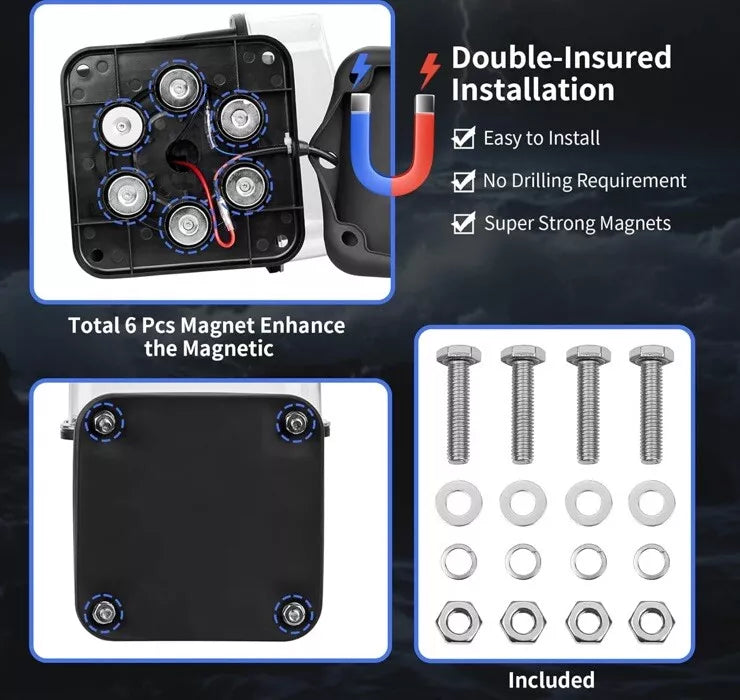 Multi-Way Mounting: The included mounting brackets for fixed mounting, and the base with 6 Strong Magnets for strong adsorption to fire trucks, boats. Both combinated mounting way is recommended for high speed driving