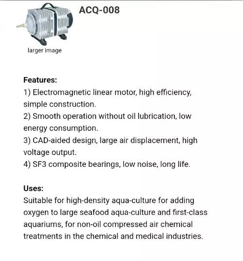 Keep your fish tank oxygen levels high with this efficient aquarium air pump. Ideal for both fish tank and pond use, this unit is a reliable choice for any aquarist. The model ACQ-008 is designed to be uséd with water type pond, making it a perfect addition to your pond aerator setup.