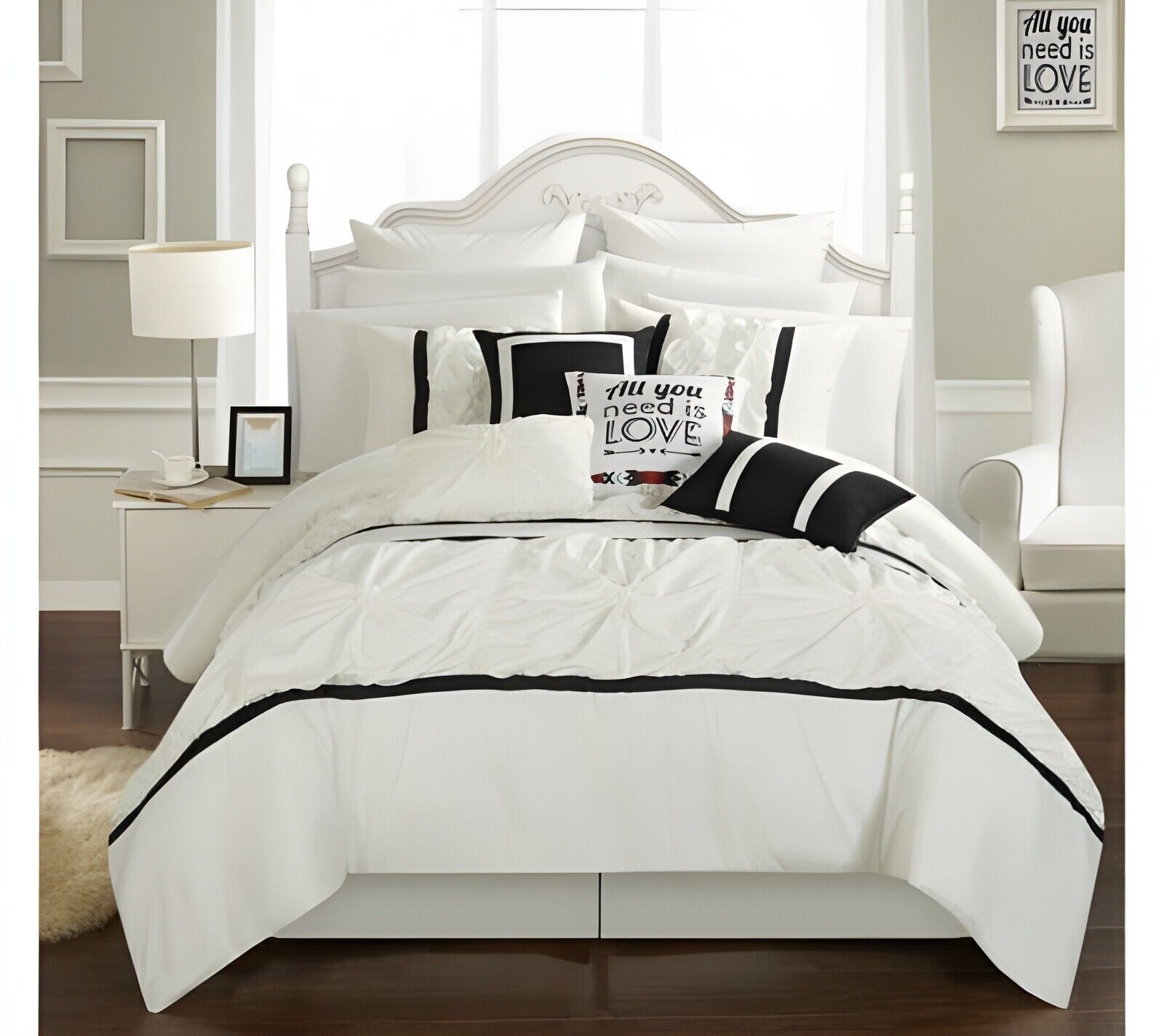 Transform your bedroom into a luxurious haven with this Chic Home CS2754-AN Ashville 16-piece Comforter Set. The set includes a king-sized comforter, two shams, and two decorative pillows, all made of 100% microfiber fabric. The geometric pattern in white adds a touch of country rustic style to your space.