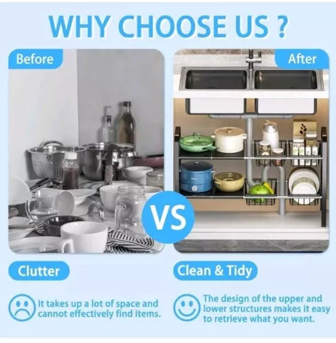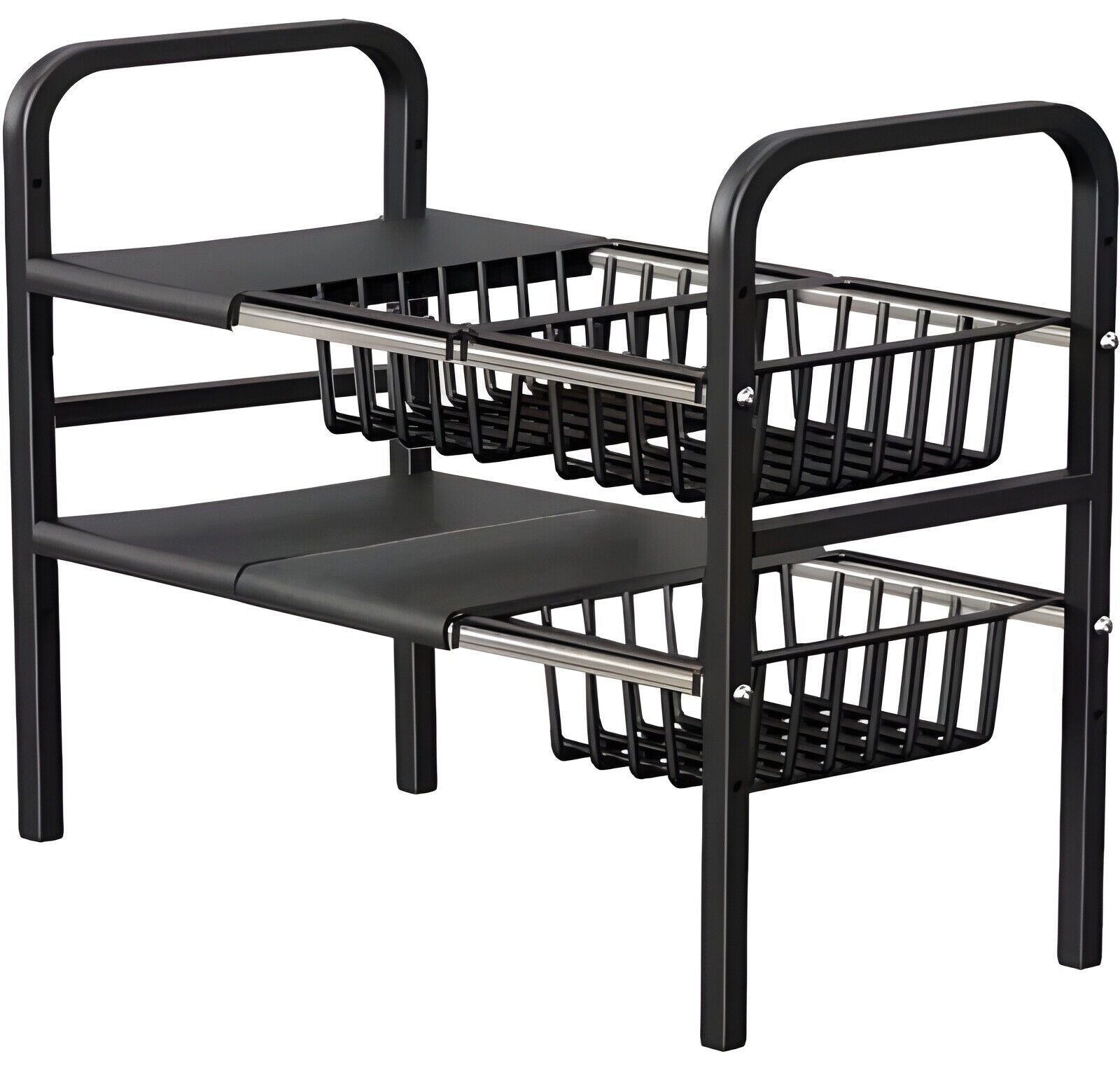 This Expandable under Sink Organizer is perfect for any kitchen. It features 2 tiers and 3 baskets to help you organize your kitchen items. The organizer is made of stainless steel and has a black finish. It is adjustable and can be mounted on the countertop.