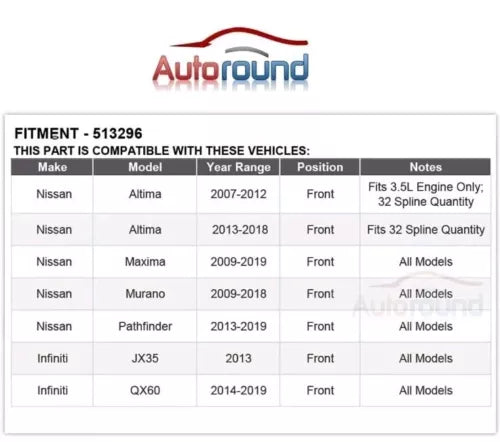 This Front Wheel Bearing and Hub Assembly is a high-quality replacement part for Nissan Maxima, Altima, Infiniti JX35, QX60, and Murano vehicles. It has a 5-wheel stud quantity and comes in a polished and rust-protected finish. The placement on the vehicle is on the left and right sides of the front. The manufacturer part number is 513296 and it has an OE/OEM part number of the same value.